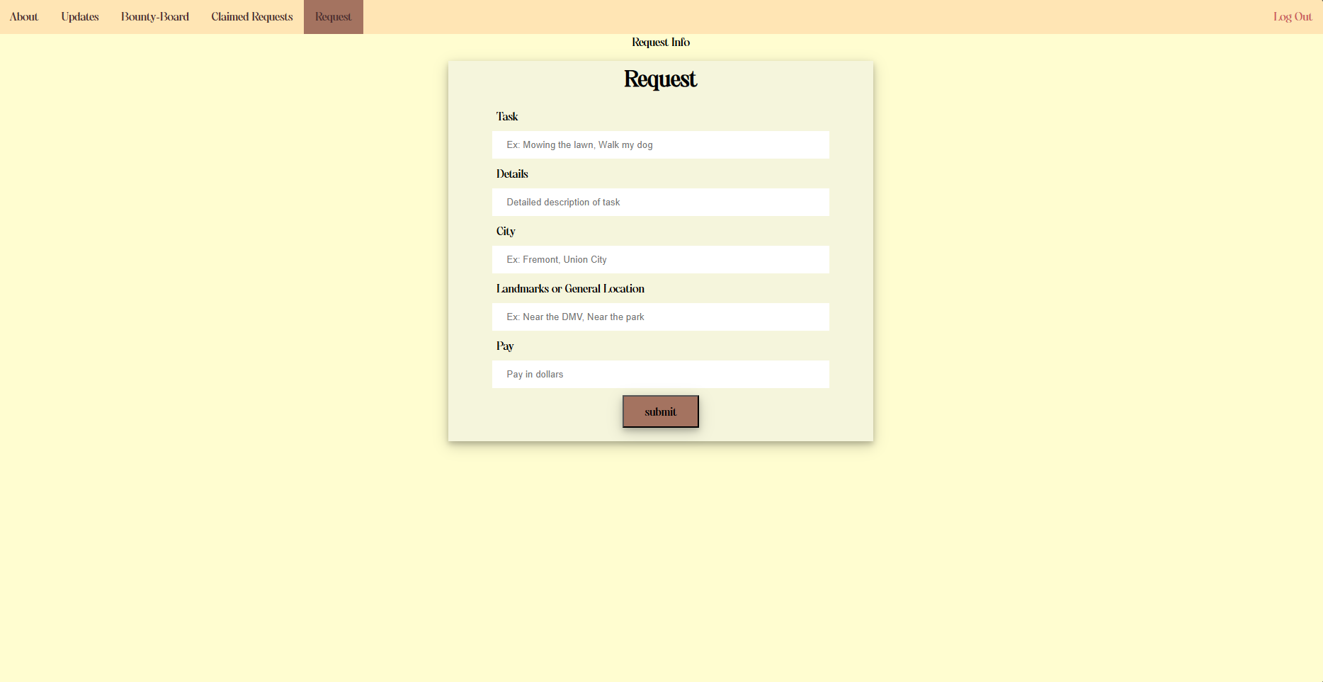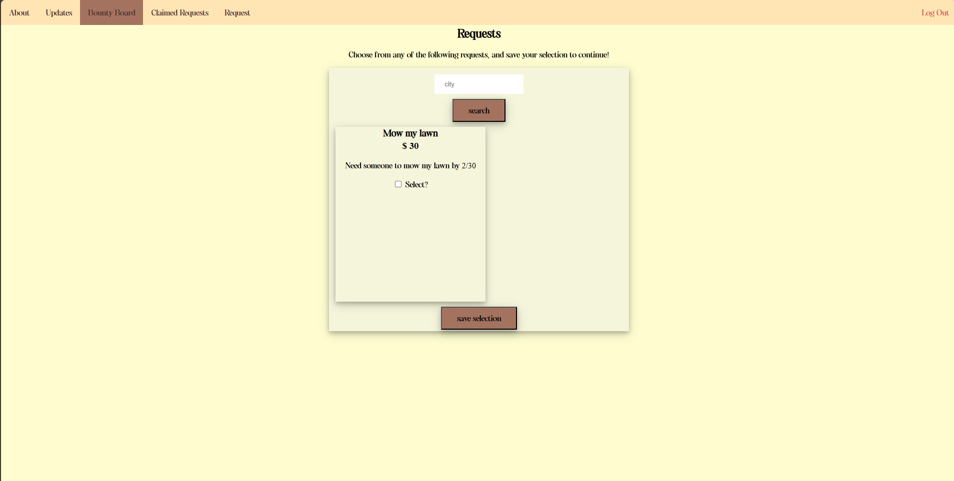 3. To claim a request, use the Bounty Board Page. Select which tasks you'd like to do, and claim them. You can also search for them by city.