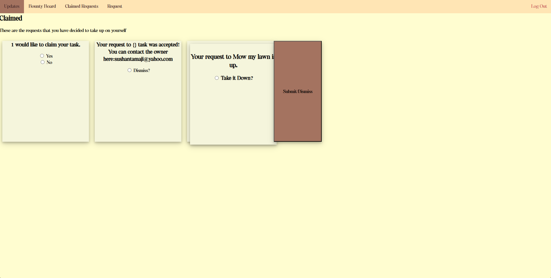 2. To check on your requests, you can use the updates page. When someone claims your request you can deny or accept their offer to do work for you. Any updates on tasks you have claimed will also be here.